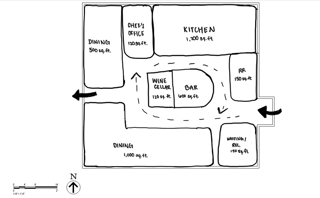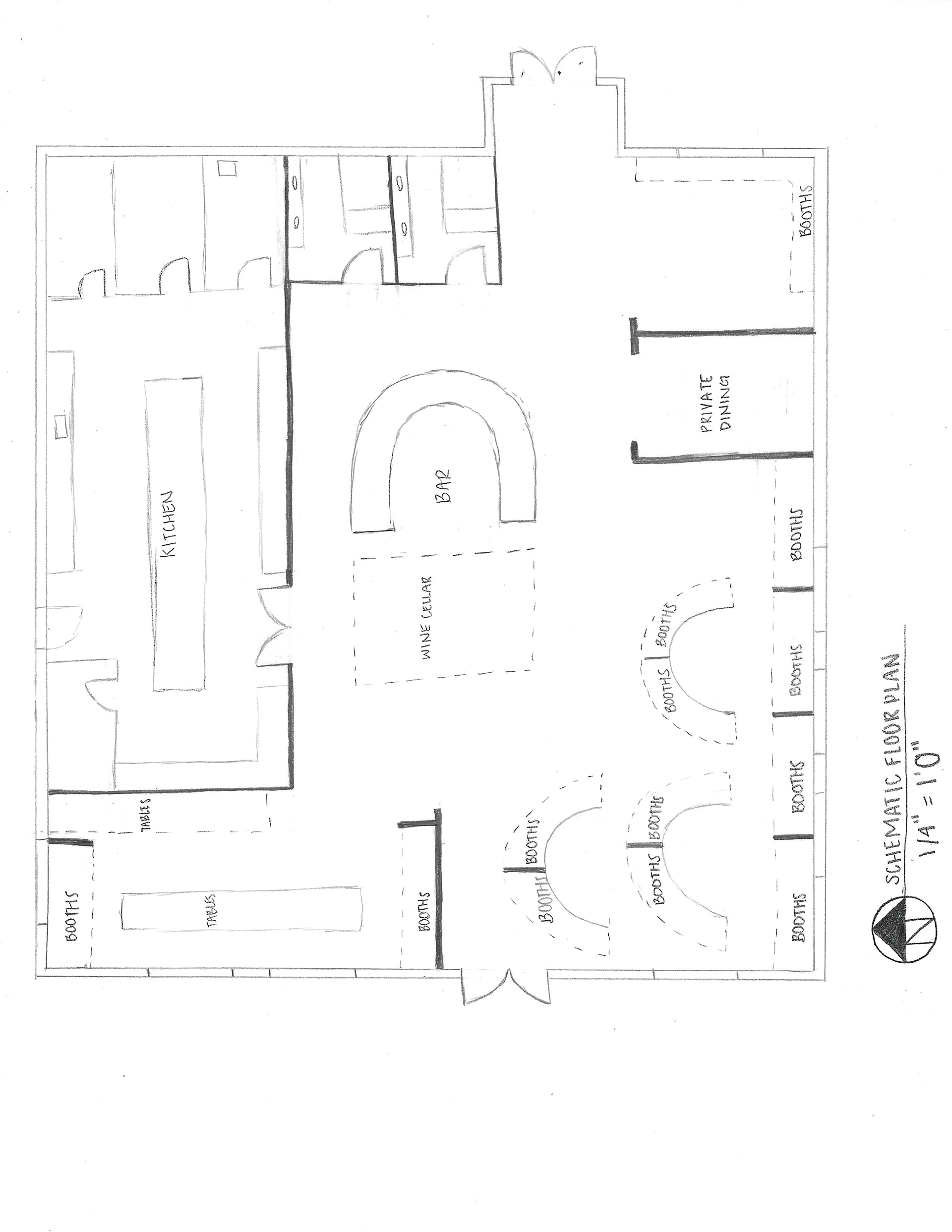 SketchUp- Private party dining on left, regular dining, and bar